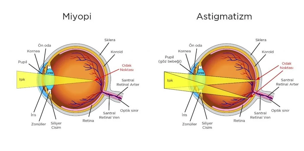 - astigmatizma ( korneanın şeklinin değişmesine bağlı gelişen kırma kusuru) bulunur.