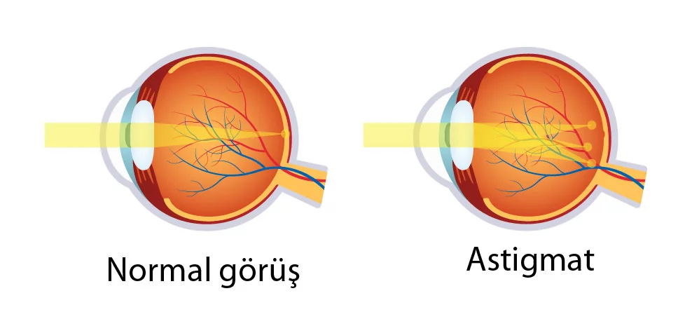 3. Astigmat: Gözün en ön kısmında yer alan ve ışığın göze giriş yaptığı yerlerden biri olan korneanın anormal eğriliğinin neden olduğu bir göz bozukluğudur. Yakındaki ve uzaktaki nesnelerin bulanık görünmesine neden olur. Astigmat göz yorgunluğuna neden olabilir.  Astigmatlı çocuklarda sıklıkla göz ovma, okula ilgisizlik ve okuma güçlüğü görülür. Ciddiyetine bağlı olarak gözlük veya kontakt lens kullanımı gerekebilir.2